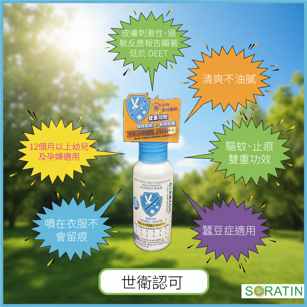 * 結合 香港科技大學 專利 MAP-1 技術 + 國際認可的 PICARIDIN: 強效驅蚊 長效抗菌 * 8小時長效驅蚊如白紋伊蚊、蠓、跳蚤及塵蟎 * 有效預防蚊媒傳染: 如基孔肯雅熱,寨卡病毒、登革熱及日本腦炎 * 洋甘菊精華: 舒緩痕癢 * 12個月以上幼兒 及 孕婦 同樣適用 * 不含酒精、樟腦 及 DEET * 可用於皮膚上,清爽不黏膩 * 不會在衣物留下痕跡 * 世衛WHO、美國疾控U.S. CDC、歐盟ECDC 認證 產地: 香港 * Combining HKUST patented MAP-1 technology with internationally recognized PICARIDIN: Powerful mosquito repellent, long-lasting antibacterial effect * 8-hour long-lasting mosquito repellent against Aedes albopictus, midges, fleas, and dust mites * Effectively prevents mosquito-borne diseases such as chikungunya, Zika virus, dengue fever, and Japanese encephalitis * Chamomile extract: soothes itching * Suitable for children over 12-months and pregnant women * Alcohol-free, Camphor-free and DEET-free * Can be used on skin, refreshing and non-sticky * Will not leave residue on clothing * Certified by WHO, U.S. CDC, and ECDC Country of Origin: Hong Kong